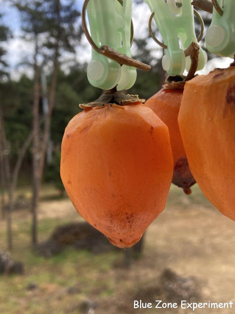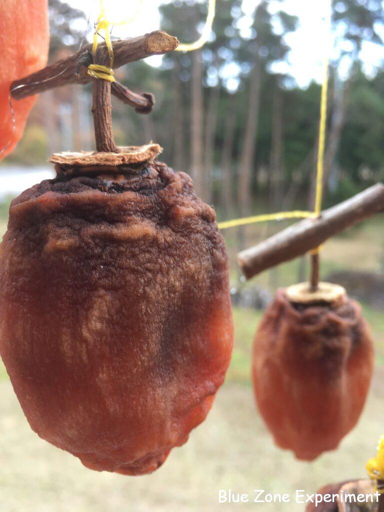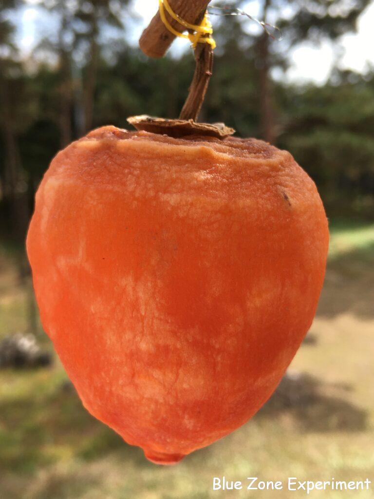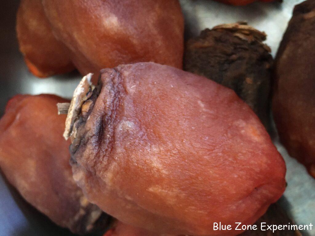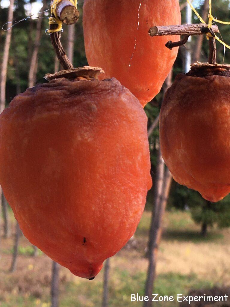 約一か月前にはじめた干し柿づくり。第一弾が成功したので、11 月 5 日には、百目柿という大きな柿で第二弾をはじめました。最初の柿は、小さかったうえに、よい天気が続いたので、たった 8 日でトロトロの最高の状態に至りました。今回の大きな柿は、もう少し時間もかかりそうです。