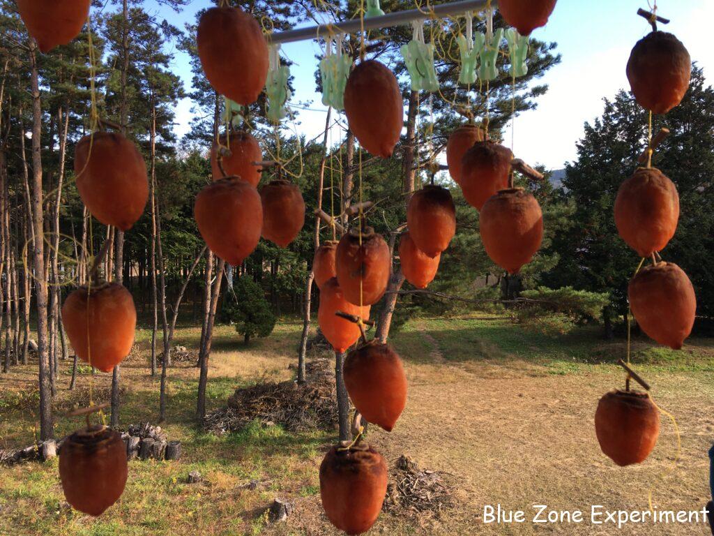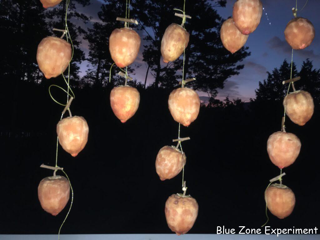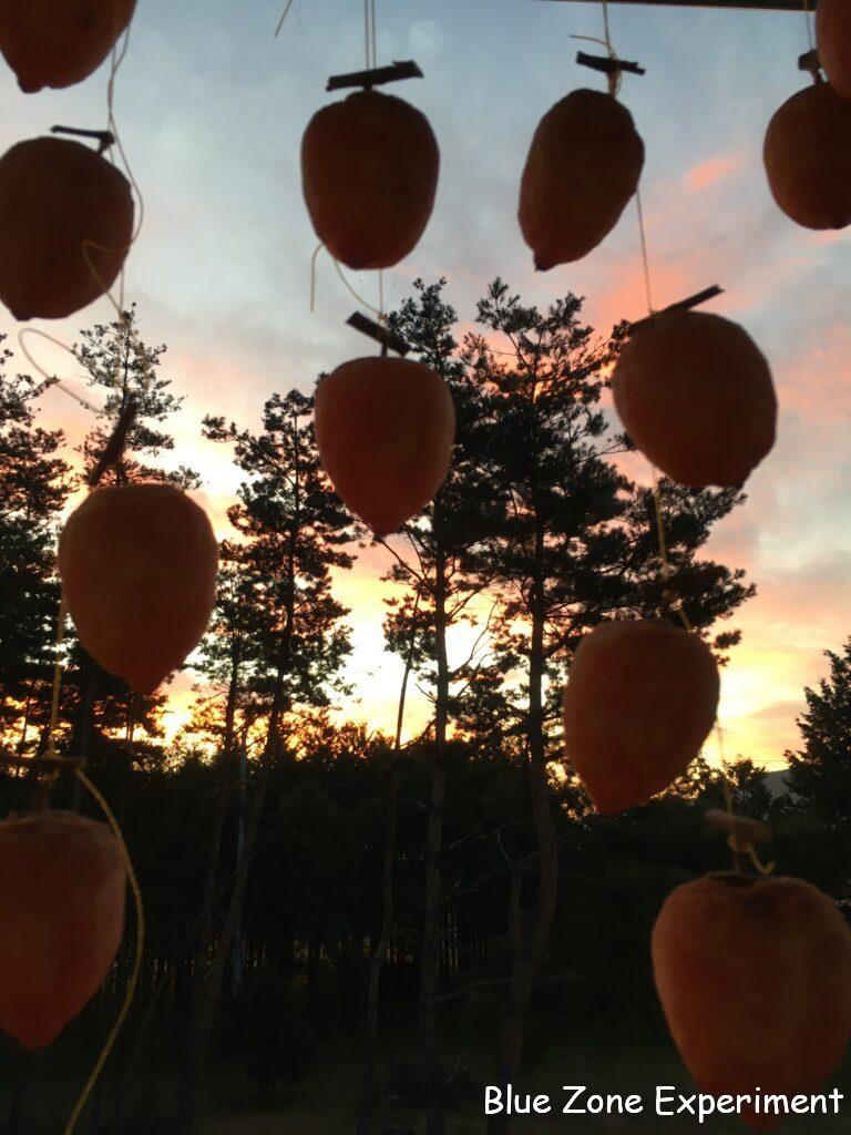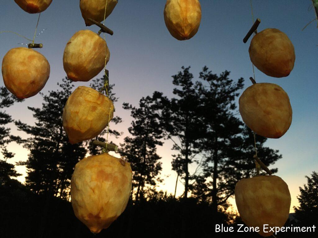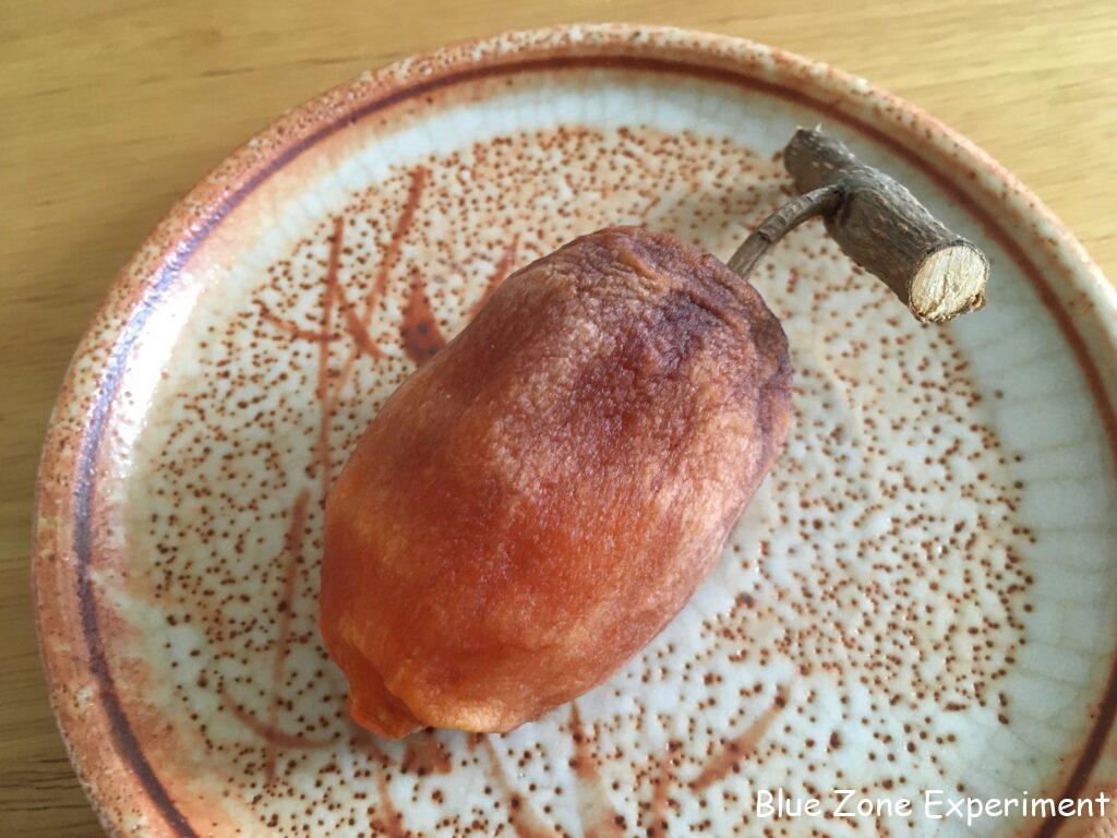 約一か月前にはじめた干し柿づくり。第一弾が成功したので、11 月 5 日には、百目柿という大きな柿で第二弾をはじめました。最初の柿は、小さかったうえに、よい天気が続いたので、たった 8 日でトロトロの最高の状態に至りました。今回の大きな柿は、もう少し時間もかかりそうです。