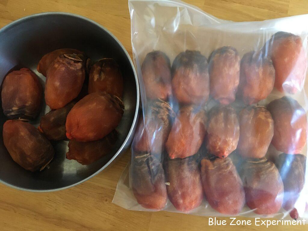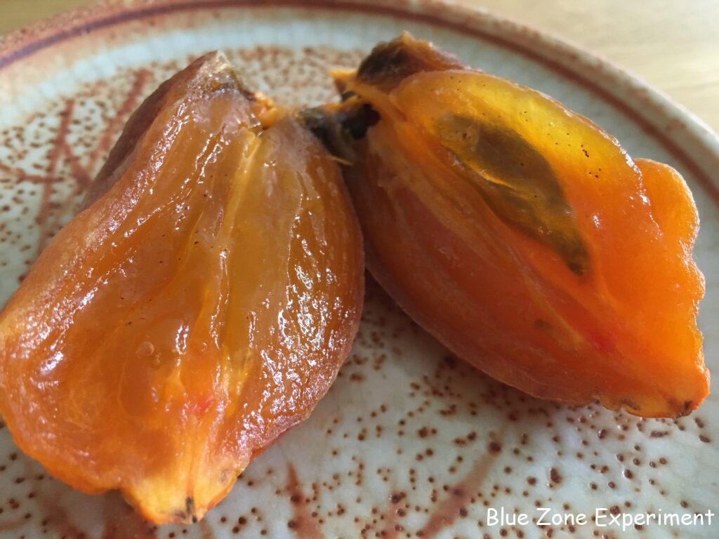 24 個の柿は、大きさがまちまちなので、出来上がり具合もさまざまに見えます。まず小さめのものを切ってみると、希望通りのトロトロです! 食べてみると、絶妙な舌触りと甘みで、文句なしのパーフェクトな仕上がりでした。その後、大きめのものも食べてみましたが、同じようにトロトロで最高の状態でした。