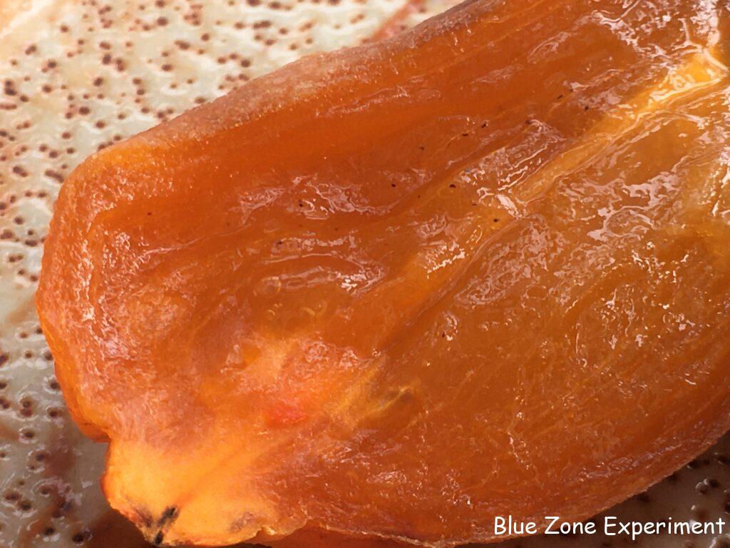さらに二日経つと(干してから一週間)、さらにオレンジ色が濃くなっています。この間に結構もんだので、一気にやわらかくなりました。干し柿をもむのは渋が内部に残らないため、と読んだので、そういうものなのかと思っていましたが、実際にもんでみると、外側ばかりが乾かないように、内部の水分を外に出して、均一にするためなのではないかと感じました。本当のところはよくわかりませんが、確かなのは、もんだ方が早くやわらかくなるということです。