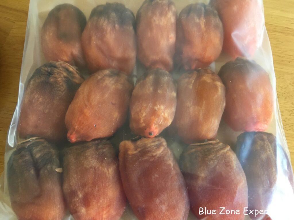 今回の柿は大きかったので、2 週間では無理かもしれないと思っていましたが、13 日後には、すっかりやわらかくなっていました。小さめの柿は、もう黒くなり始めています。前回、トロトロの状態で試食したあと、残りはしばらく干し続けましたが、結局トロトロのときが一番おいしいことを学びました。今回は、その最高の状態を目指して、13 日ですべて一気に取り入れます。