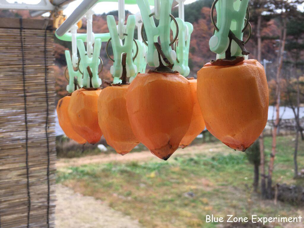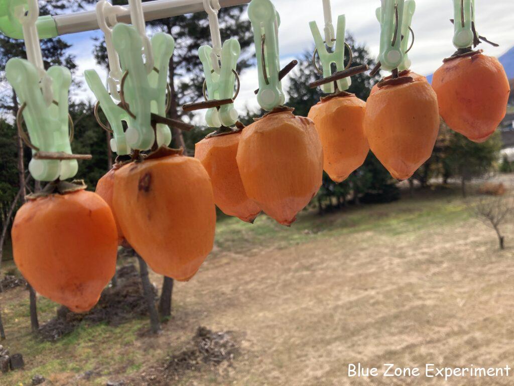 干し柿づくりはこれで終わるはずでしたが、先日、道の駅でまた小さな干し柿用渋柿を見つけてしまいました。悩んだ結果、やはり購入してしまいました。今回は 10 個と少量です。買ったのはいいのですが、その後天気の悪い日が続き、ぐずぐずしていると、柿がやわらかくなってきてしまいました。あまりやわらかくなると干し柿にはしにくいので、天気は無視してとにかく干すことにしました。今回は、簡易に小物干しの洗濯ばさみで挟んだだけです。小さい柿なので、うまくバランスをとると、なんとか柿同士がくっつかないように吊るすことができました。11 月 22 日に干し始めて、翌日は一日雨だったので心配しましたが、今日 3 日目には、表面が乾いているようです。熟して汁が出ているものもあったのですが、触ってみると乾いています。今回は、殺菌をしていない上に雨がかなり降ったので、カビが心配でしたが、今日は午前中よく晴れていて、午後からは曇っているものの強い風が吹いているので、なんとか大丈夫なのではないかと思います。最初の 8 個は、殺菌のために焼酎をまぶしたのですが、二回目は何の殺菌もせずに挑み、大きい柿でしたが、カビは発生しませんでした。今回もきっと大丈夫なはずです。あと 4~5 日で完成すると思われます。