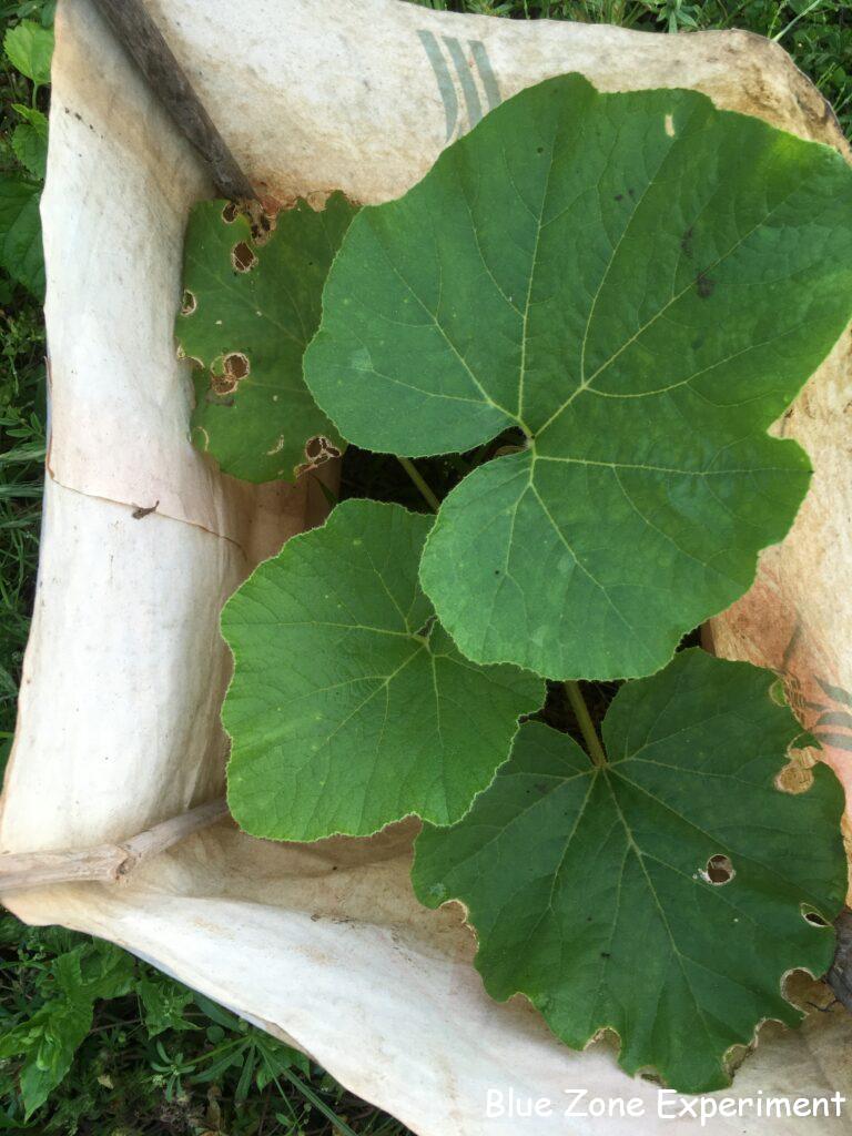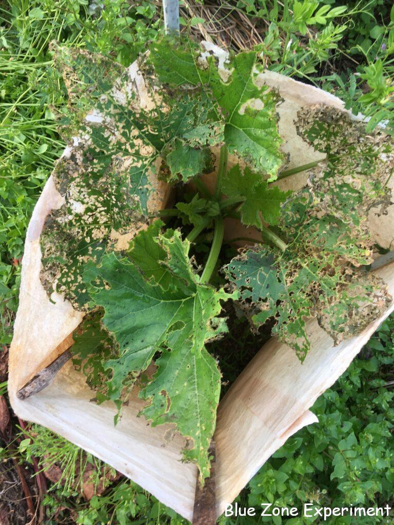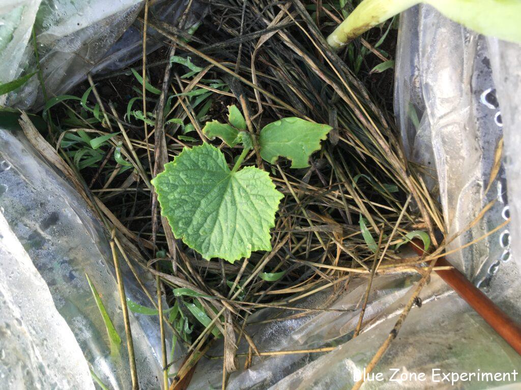 ボロボロのズッキーニのすぐ隣にはカボチャを植えていますが、こちらは被害が非常に少ないです。あんどんから上に出ていないからかもしれませんが、ズッキーニは、あんどんの高さを超えていなくてもかなりの被害です。別の場所にあるキュウリは、双葉がボロボロです。これはウリハムシなのか、別の虫なのかわかりませんが。