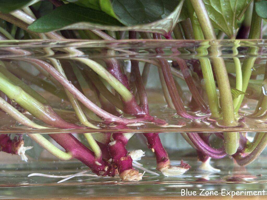 苗は、昨日のうちに芋から切り離し、根元だけ水につけておきました。発根してから植えたほうがよいとも聞きますが、昨日はよく降っていたので、畑はかなり湿っているはず。それに、今日の午後から明日にかけては曇り、明後日からは雨の予報です。この条件なら、発根していなくても問題なく活着すると期待して、なるべく早く畑に出すことを優先しました。