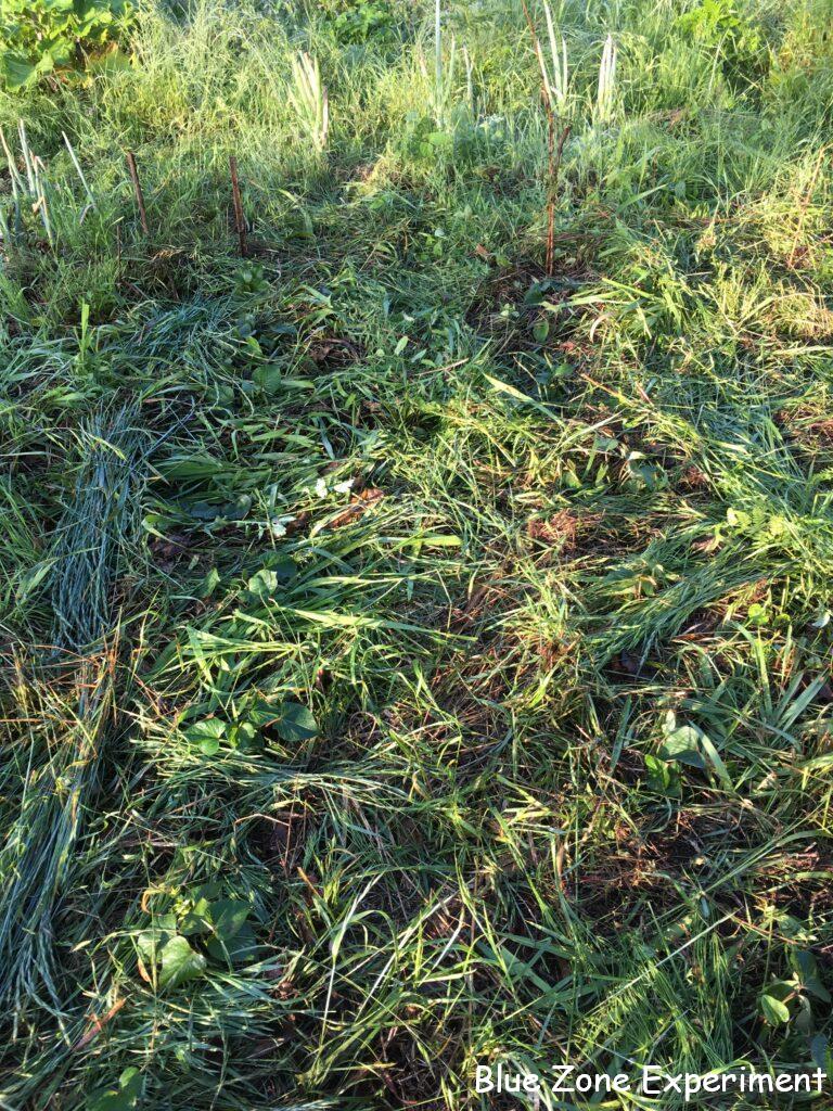 サツマイモの植え方は、斜め植え、水平植え、船底植えなどいろいろありますが、私の短い苗では、垂直植えしか選択肢はありません。新芽の部分を地上に出さなければならないのですが、そうなると、土に埋める部分が非常に短くなり、うまく斜めに挿すことなどできません。新芽がギリギリ出るように気をつけながら、まっすぐに挿しました。今日の午前中は日も出るようなので、土が乾燥しないように、念のため草をたっぷりかけておきました。