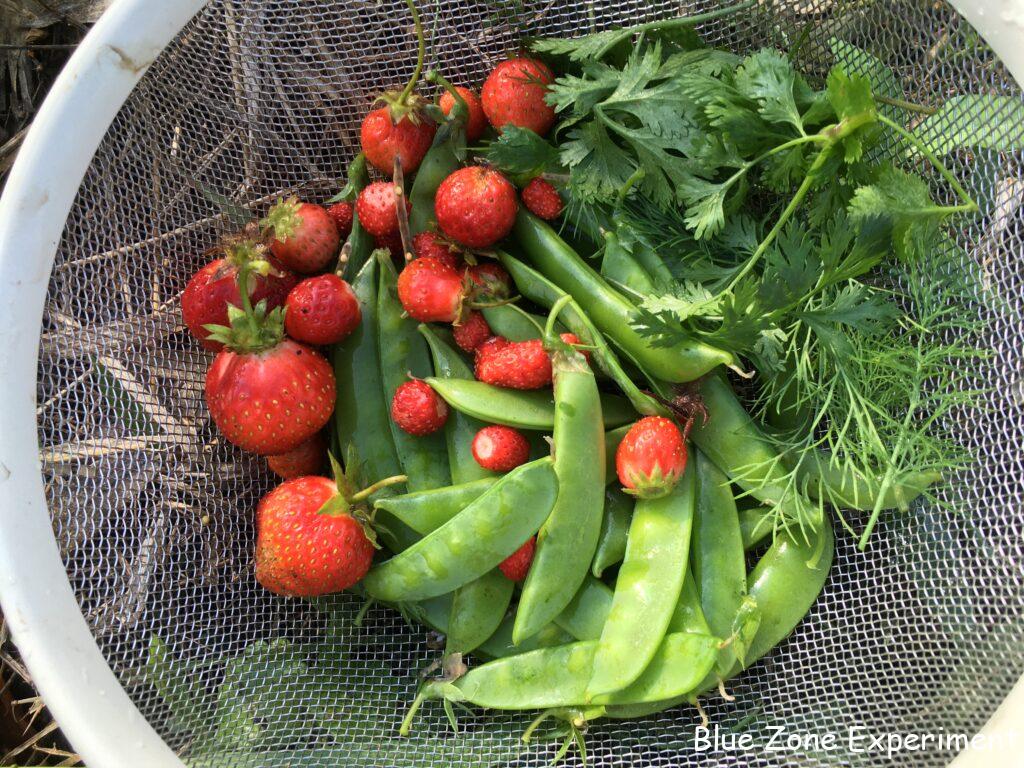 イチゴが少しだけ採れました。鳥や動物に気づかれてきたようで、かじられているものがたくさんありました。シーズンももう終わりです。ワイルドストロベリーも少し収穫しました。スナップエンドウとキヌサヤは、今日もたくさん採れました。あとはディルとパクチーを少しずつ。