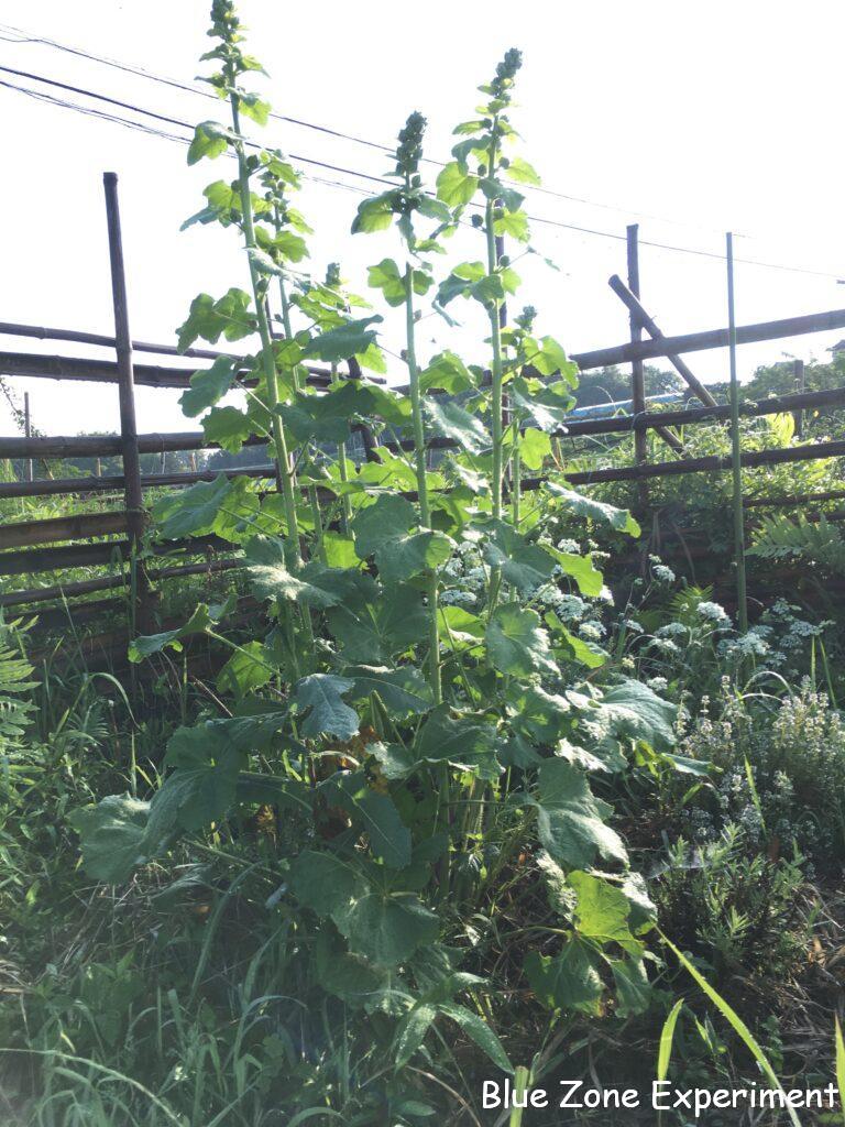 貸農園から持ってきて移植したタチアオイは、どんどん育っています。去年もよく育っていたのですが、他の作物に干渉してどうしようもなかったので、やむなく切ってしまいました。今年は、花を見たいものです。同じアオイ科でも、寒さに弱いオクラは、まだ成長がゆっくりです。