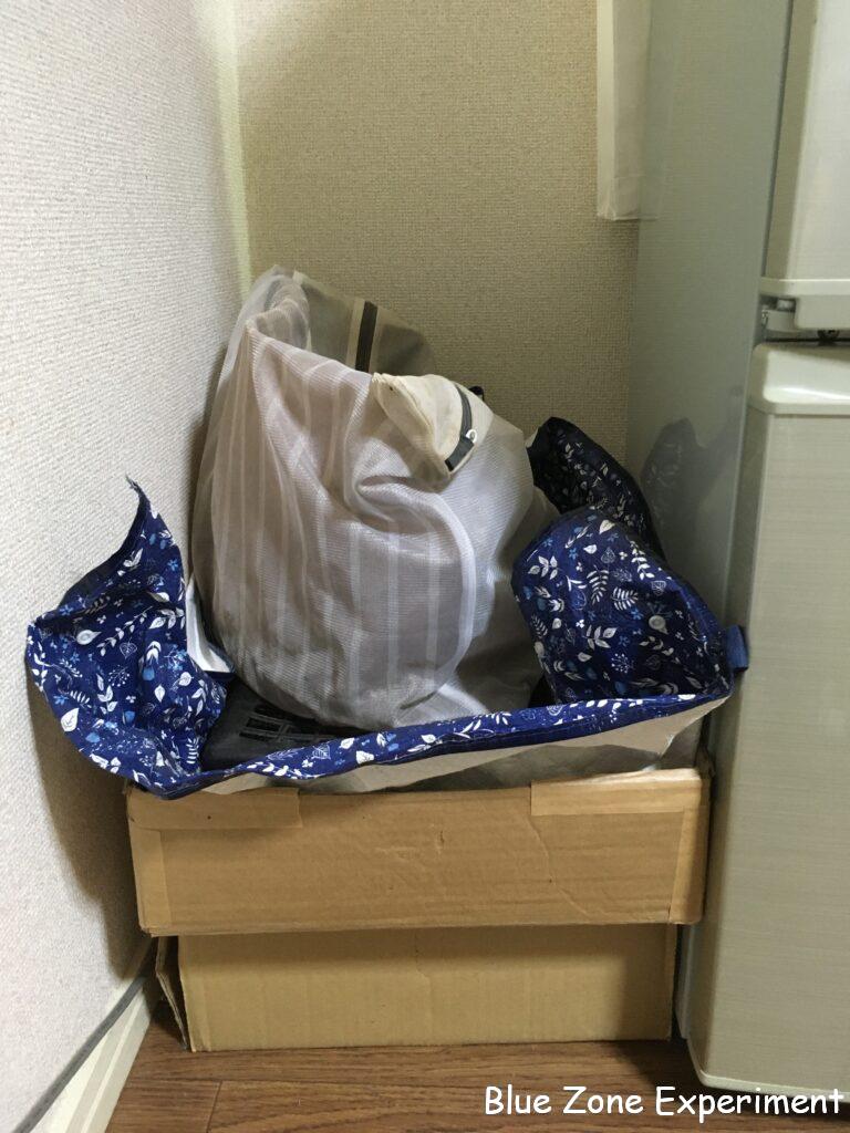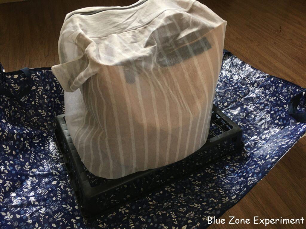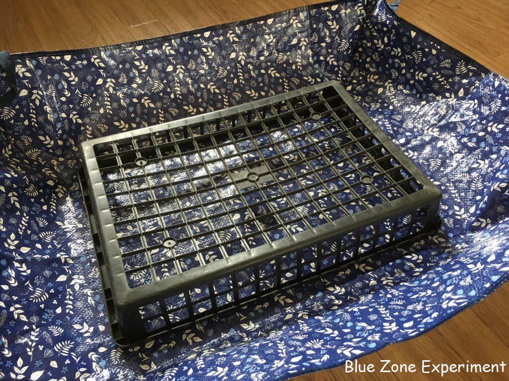 分解には水分が必要なので、生ごみは水を切らずに入れていましたが、不織布ポットは水を通すので、下に敷いていた段ボールがじっとりしてきてしまいました。そこで、園芸シート(ダイソー)を敷いた上にプラスチックのカゴ(ホームセンターの苗コーナーにおいてあるもの)を逆さにして置き、その上にコンポストを設置することにしました。これで通気性は確保しながら、床を濡らすこともありません。さらに念のために、これを薄いダンボール箱に入れ、その下にも薄いダンボール箱を置きました。下にダンボール箱を置いたのは、温度が下がりすぎないようにとの狙いもあります。冬場は気温が下がり分解がかなり遅くなるので、床との間に空気の層があれば、少しはマシなのではないかと考えてのことです。設置場所は、冷蔵庫の横ですが、これは生ごみを捨てるのに便利というだけでなく、冷蔵庫の熱気で少しは温度が上がるので一石二鳥です。見かけはすこぶる悪いのですが、機能性と作業性については、今の形でほぼ満足しています。