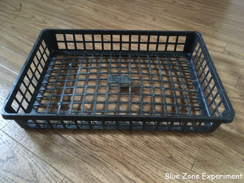 調べてみると、コンポストには、段ボールや木箱、プラスチックの衣装ケースやバケツなど、いろいろなものが使えそうです。うちにはちょうど、グリーンカーテン用に購入した 5 個セットのポットが一つ余っていたので、これなら通気性も耐久性も兼ね備えていて最適だと思い、これを使うことにしました。ただこのポットには蓋がなく、そのままでは虫が入り放題です。そこで、虫対策として、ポットごと洗濯ネットに入れることにしました。