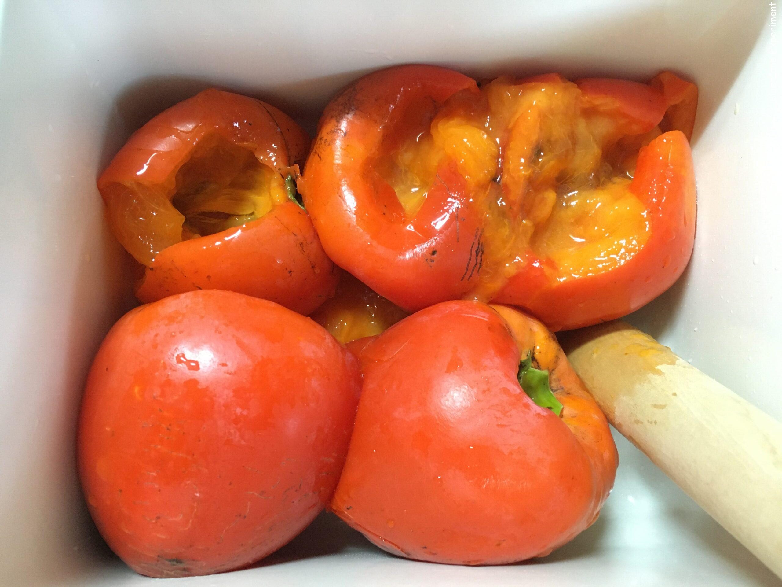 柿酢の作り方はきわめて簡単です。今回は熟した柿を使いましたが、熟していない場合は、十分に熟してやわらかくなるのを待った方が作りやすいと思います。