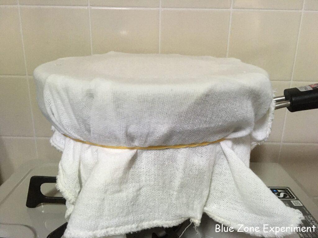 3. 通気性のある生地などで容器を覆います。わたしは、容器の口に布巾をかぶせて輪ゴムで留めました。発酵には酸素が必要ですが、酢には虫が寄ってくるので、このように布をかけて虫を防ぐ必要があります。