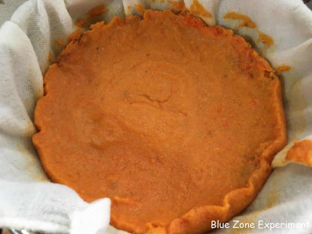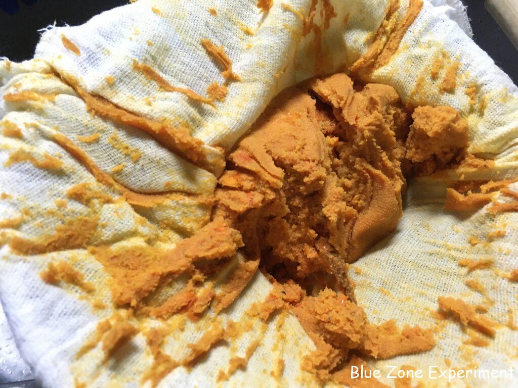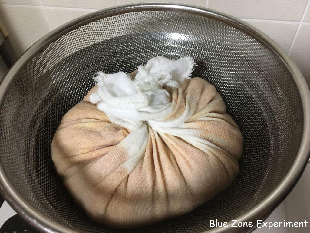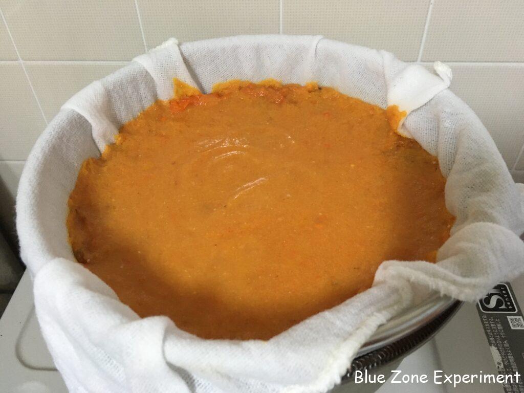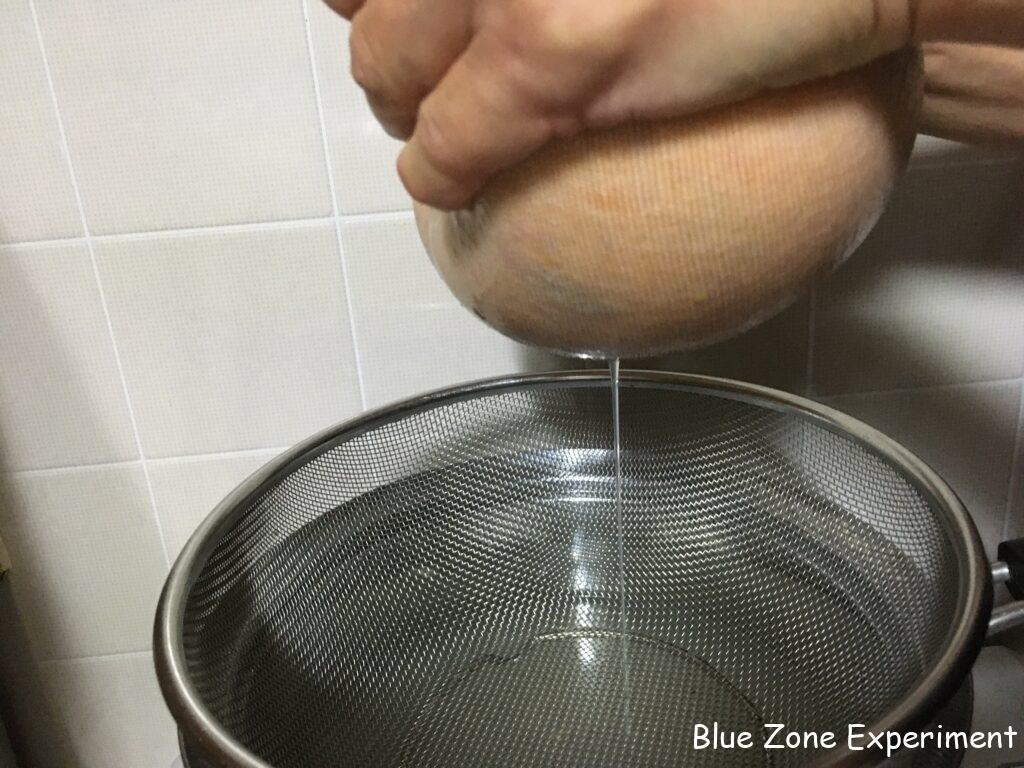 5. 仕込んでから約一か月後、酢の匂いがしていれば、布で濾します。鍋などの上にザルをセットし、その上に布巾などを敷いてから、できた柿酢を注ぎ込みます。ザルの下の容器には、濾された酢がたまるのに十分なスペースがあることを確認してください。下の容器とザルの大きさが同じくらいだと、濾された液体が落ちて行かないばかりか、せっかくできた酢がこぼれてしまいます。わたしは、ショウジョウバエなどが心配なので、上からも布巾をかぶせました。このまま、無理に絞ったりせず、そのまま放置して水分が落ちるのを待ちます。わたしは、5~6 時間待ちましたが、一晩置けばよりよいと思います。その後、布ごと手で絞ります。