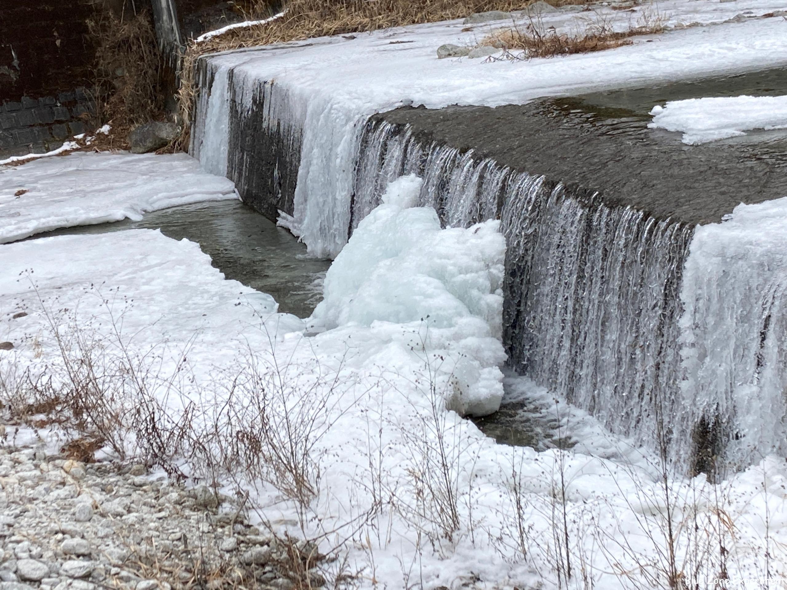起きたときの外気温は、マイナス 5℃。最も寒い台所は 2℃。お昼過ぎに散歩に出かけたときの外の気温は 4℃で、日差しがほとんど届かない曇り空でした。昨日と温度は変わりませんが、太陽が出ていないと体感温度が全く違います。ただ、風がなかったので、歩いているうちに体は温まりました。せっかく自然に囲まれた場所に住んでいるので、早歩き散歩は前半だけにして、後半はゆっくりと自然を楽しむことにしました。今日は、昨日通りかかった凍った川をもっと近くで見ようと、対岸に行ってみることにしました。上流からの水の流れはありますが、滝状に流れ落ちる水の一部は完全に凍ってつららのように垂れ下がっています。まだ凍らずに流れ落ちる滝の前には、彫刻のような白い大きな塊。落ちた水が跳ね返って凍り、それが徐々に大きくなったものと思われます。川沿いにある雑木林には、落ち葉のじゅうたんがふかふかに敷き詰められていました。鹿が食べ物を探しにやってくるのか、たくさんの糞が落ちていました……。